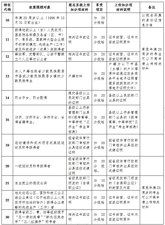 3.申请照顾政策加分的考生,除提交本人身份证原件和相应的起点学历证书外,还应提交以下相应加分材料的原件和复印件。考生在填写报名信息后,同时在报名系统中上传照顾政策加分的材料