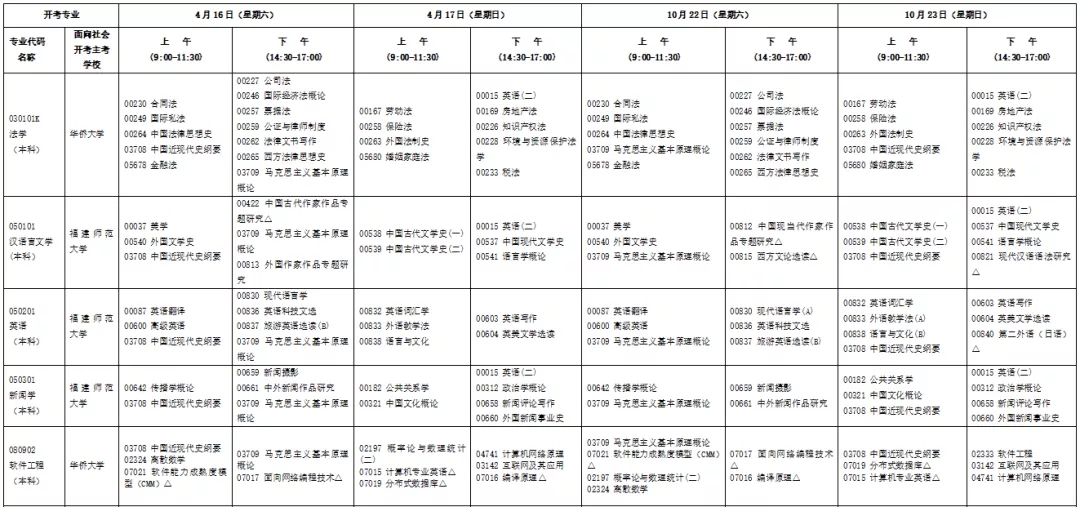 2022年4月和2022年10月福建省高等教育自学考试开考专业理论课程考试安排表